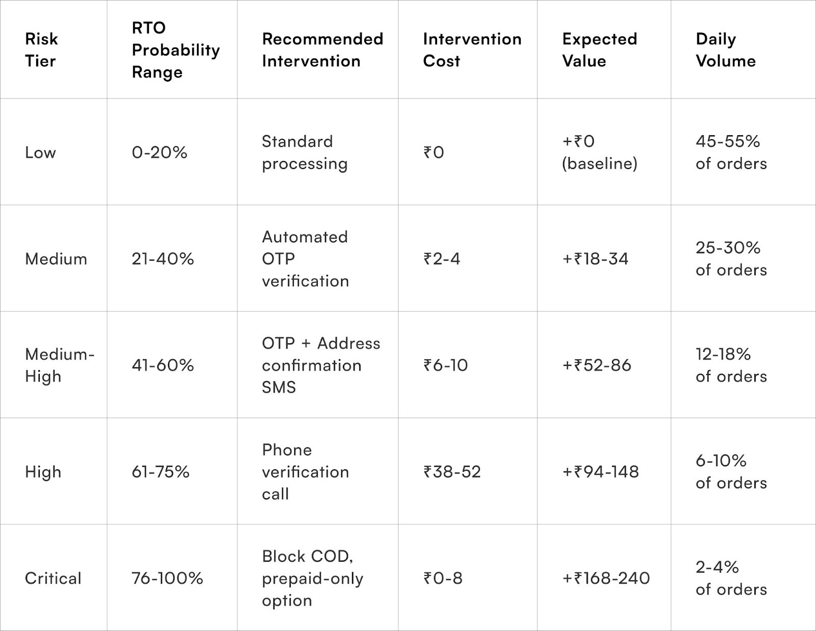 - A ₹45 phone verification is justifiable for a ₹2,000 order with a 70% RTO probability (expected loss: ₹560).