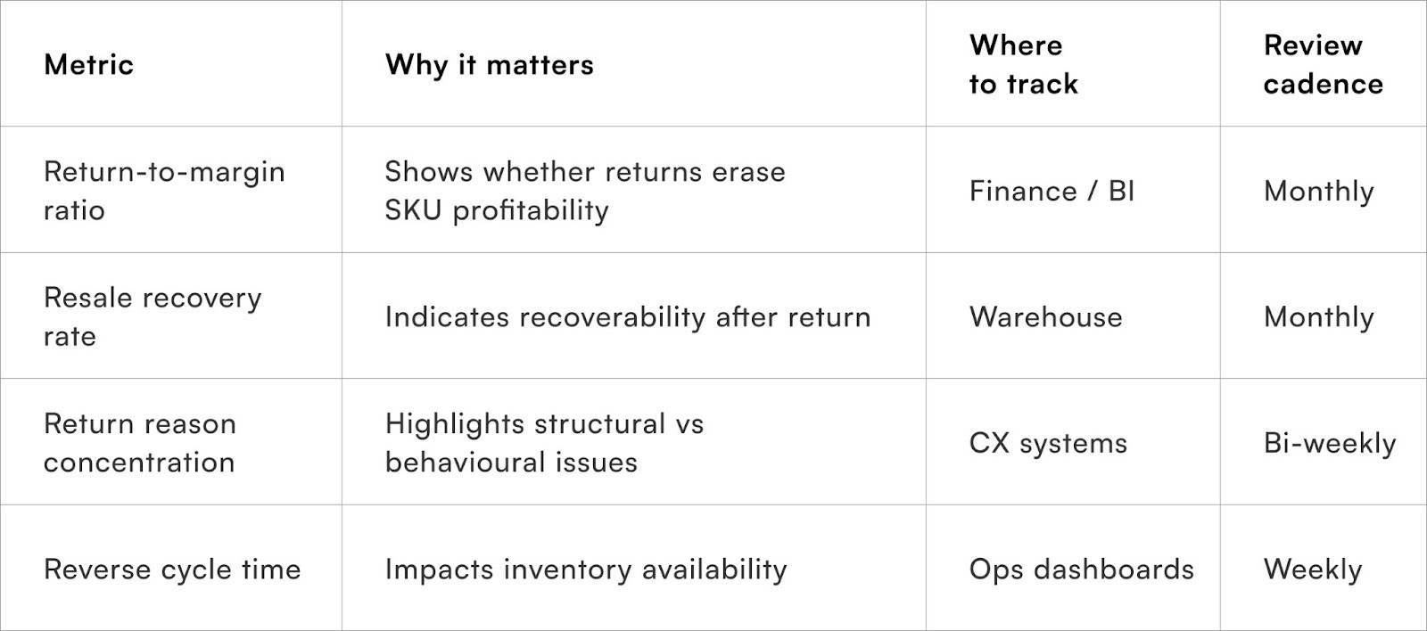Tracking return rate alone hides more than it reveals. SKU-level policies require metrics that capture both financial and operational impact.