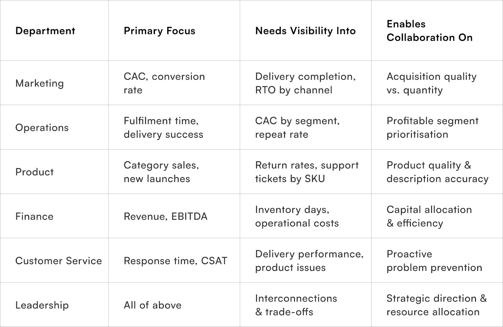 Shared visibility into interconnected metrics enables collaboration toward common goals rather than departmental silos